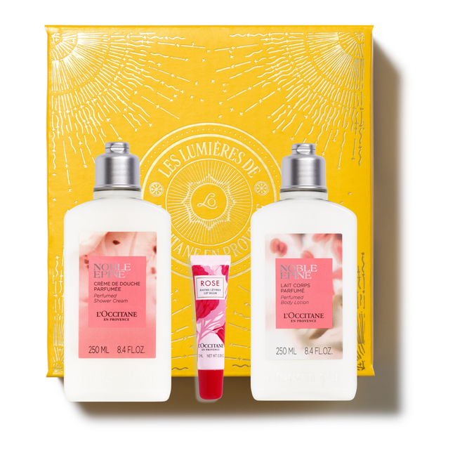 Нежный и женственный набор создан для парфюмированного ухода за телом. Аромат Noble Épine окутывает кожу мягкими цветочными нотами, даря ощущение свежести, уюта и весеннего настроения. Средства бережно очищают, увлажняют и питают кожу, оставляя её гладкой, ухоженной и приятно ароматной. Идеальный вариант для подарка или ежедневного ухода.Состав набора:парфюмированный крем для душа 250 мл,парфюмированное молочко для тела 250 мл, бальзам для губ Rose 12 мл.